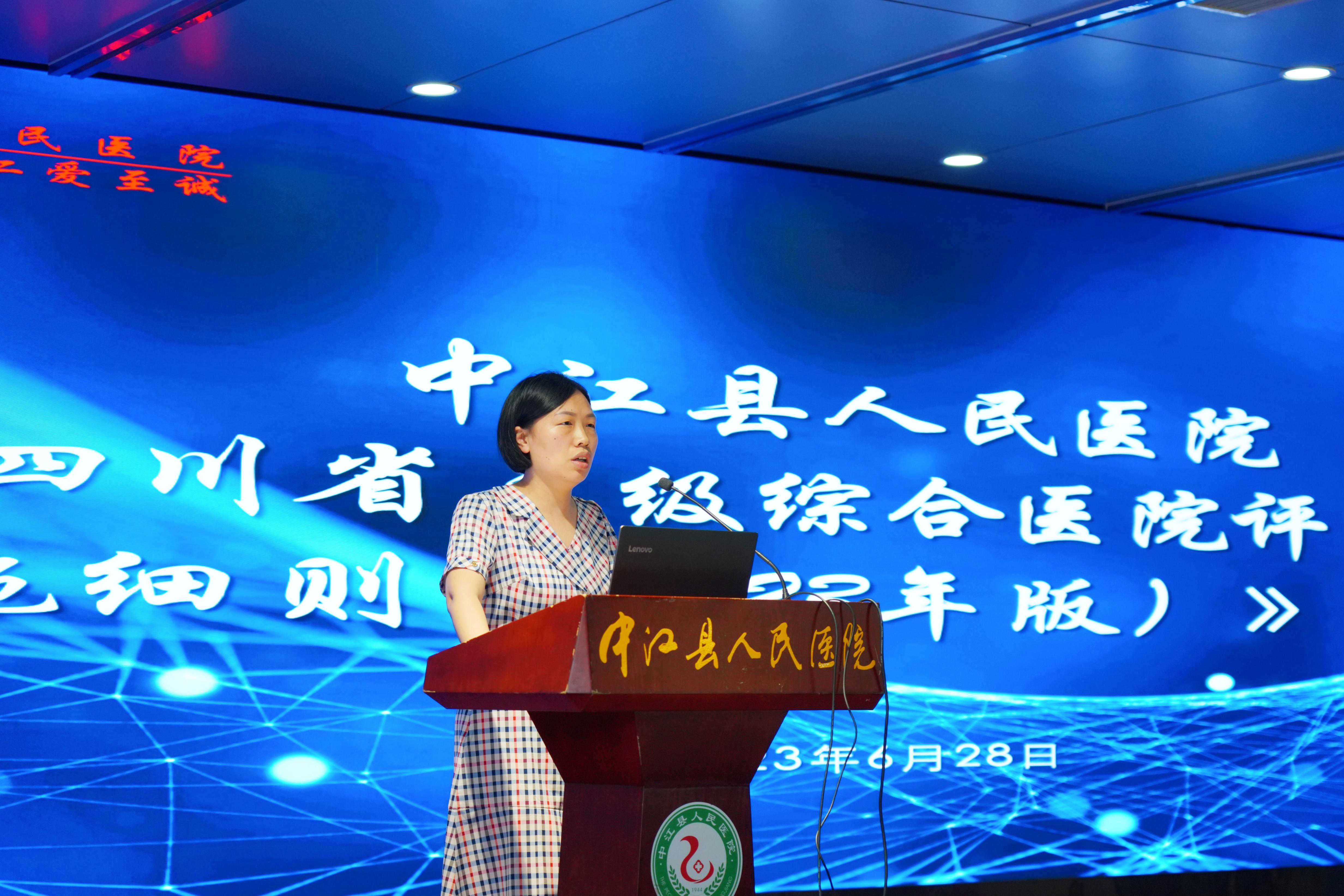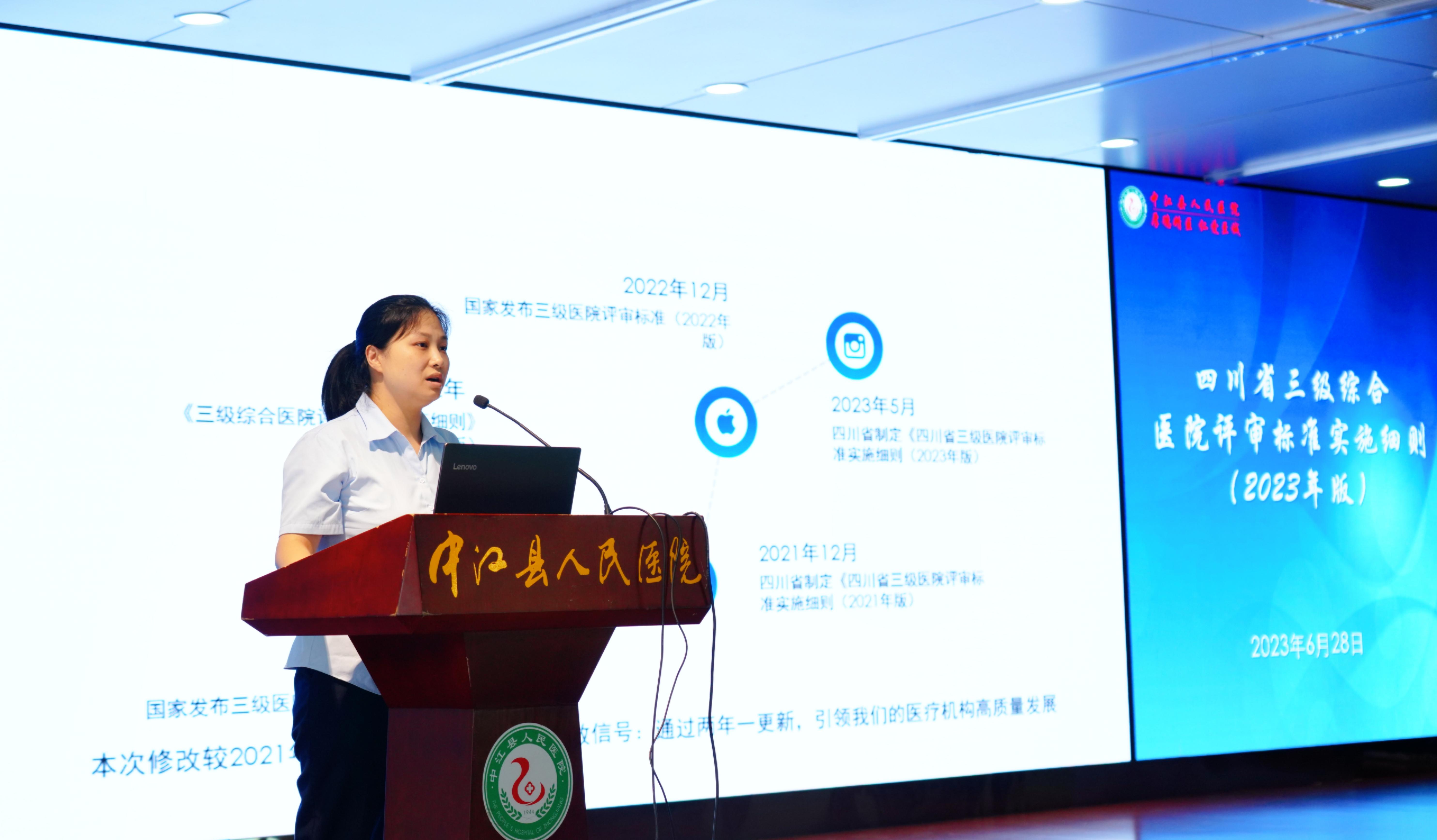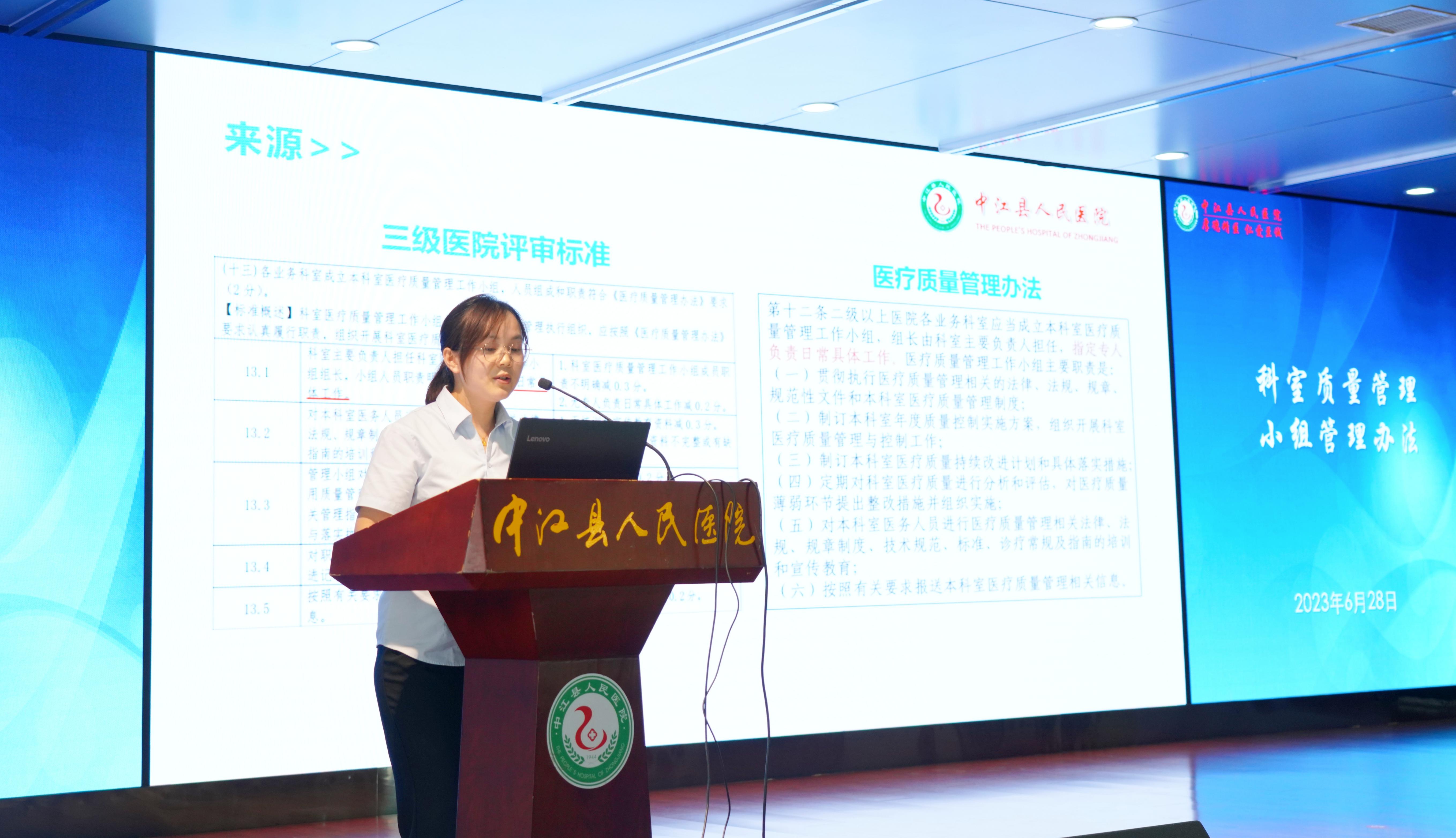 2023年6月28日下午,我院召开《四川省三级综合医院评审标椎实施细则(2023年版)》培训会(图为肖艳讲解《科室质量管理小组管理办法》《国家医疗质量安全管理目标工作实施方案》)