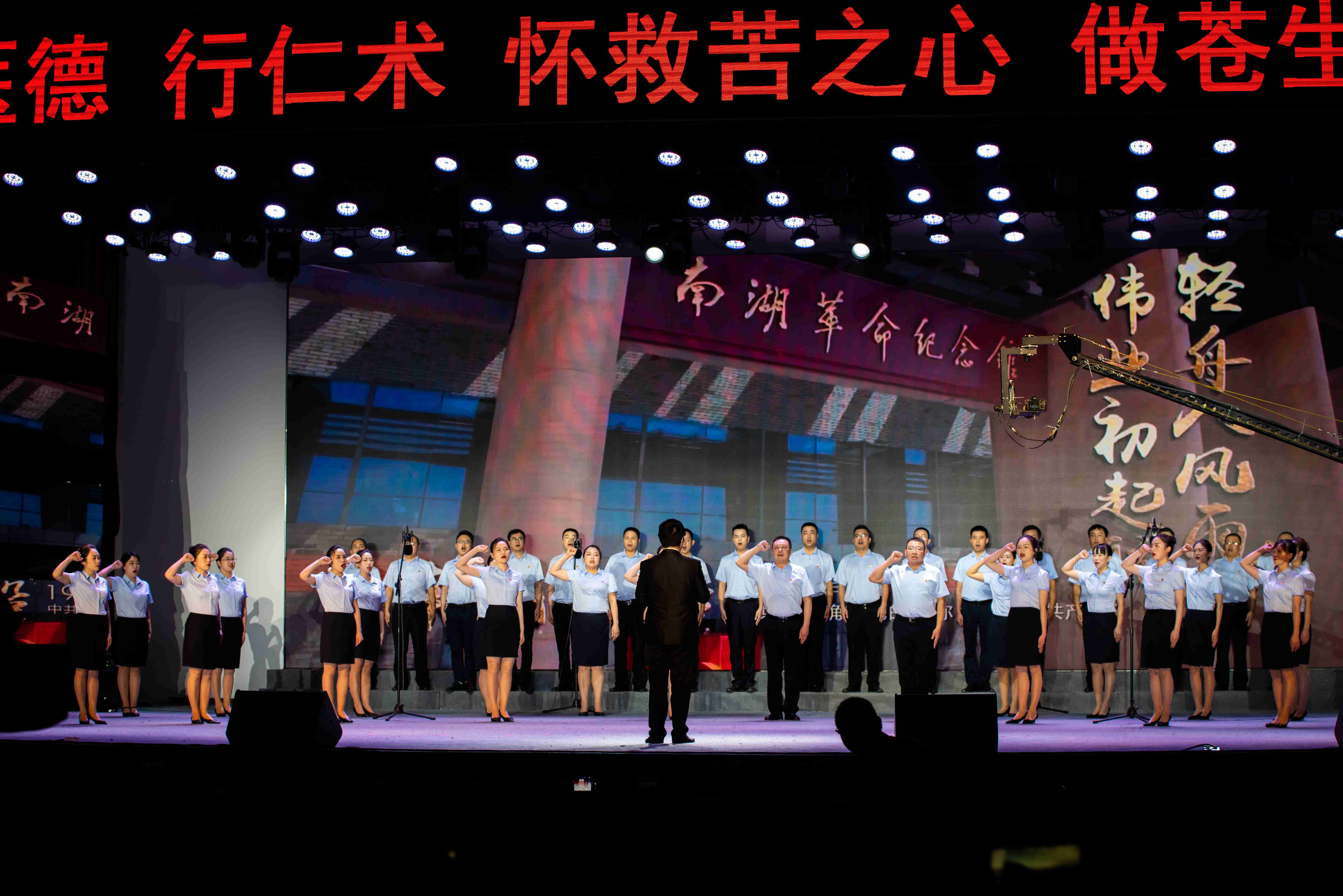 2021年6月17日晚,我院在中江县市民中心举办了”百年初心,医心向党——庆祝中国共产党成立100周年文艺汇演及先进表扬“晚会。图为大合唱《我宣誓》
