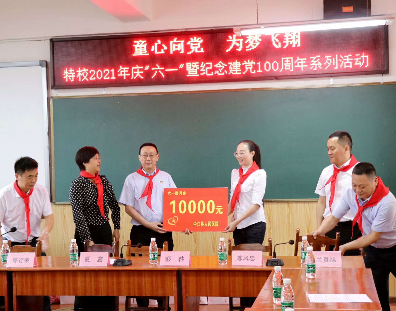 2021年6月1日,我院康复医学科医护人员走进中江县特殊教育学校开展脑瘫孩子社会融合实践活动(图为陈凤忠副院长代表医院为学校赠送了慰问金)