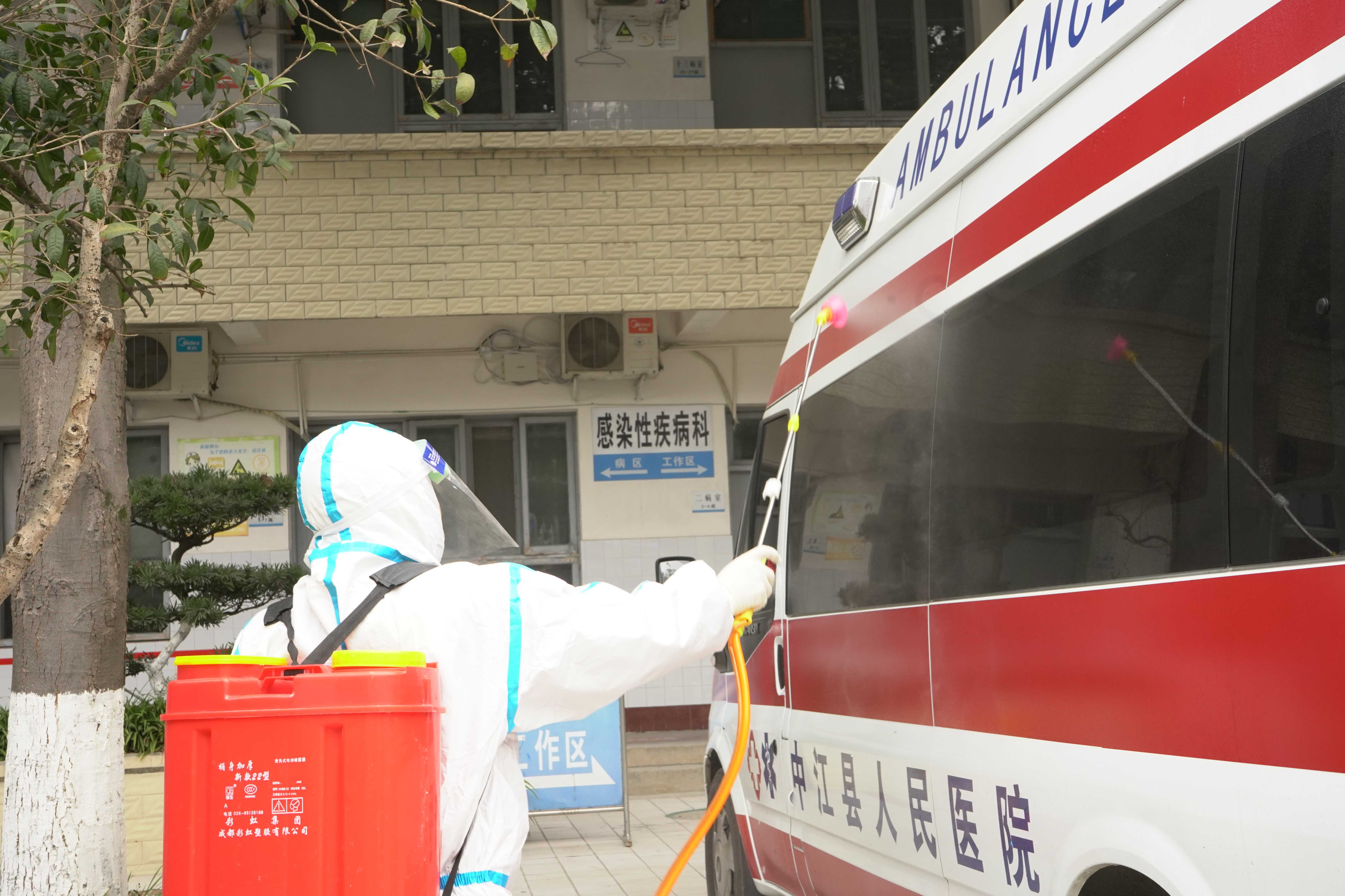 2021年2月2日,我院参加全县核酸采样应急演练。图为患者转运车辆消毒模拟