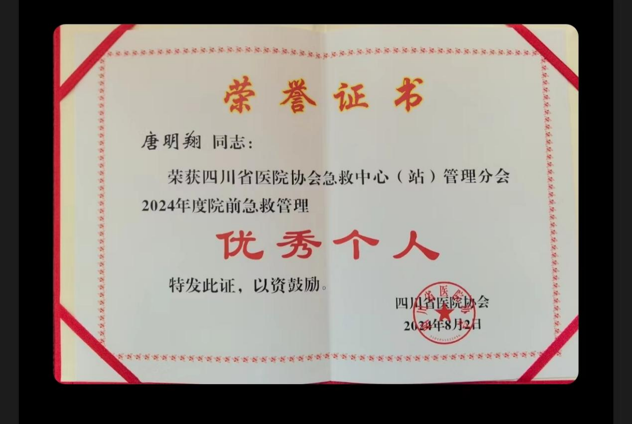 2024年8月2日,在第七届西部院前急救学术大会上,我院急诊科主任唐明翔荣获四川省医院协会急救中心(站)管理分会2024年度院前急救管理优秀个人奖。