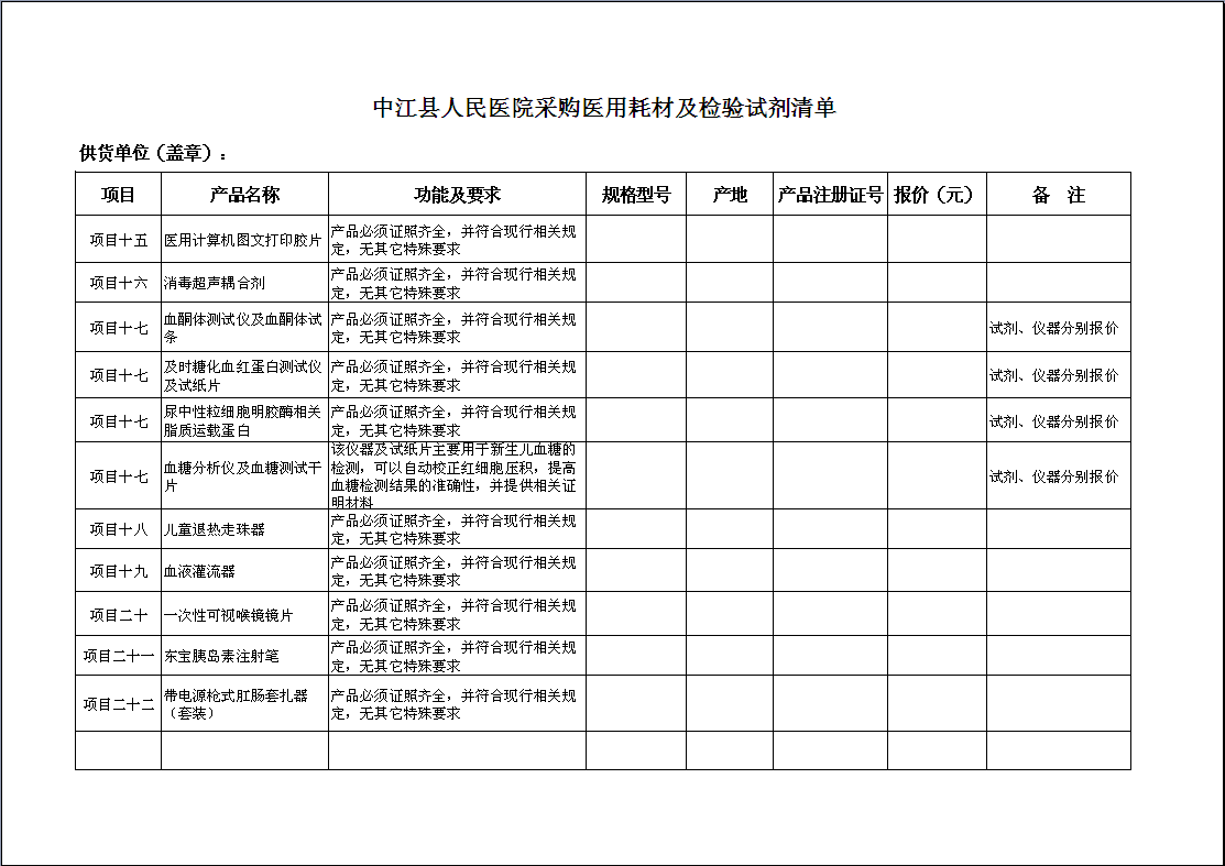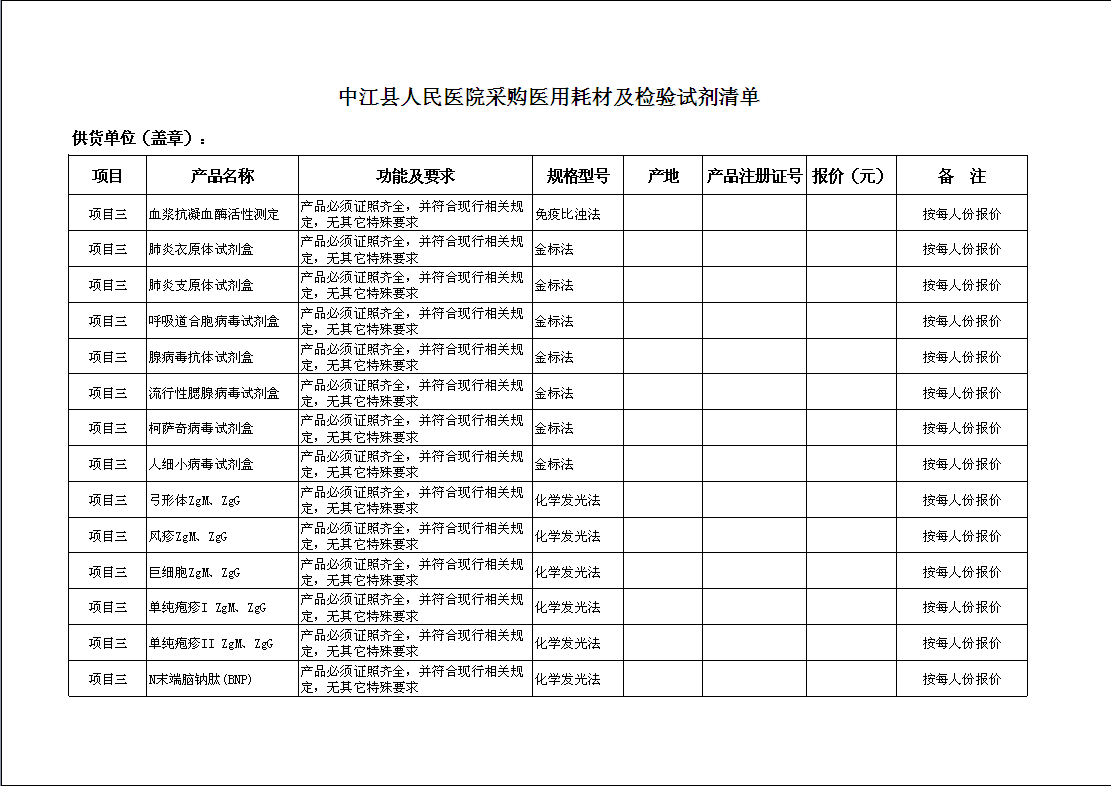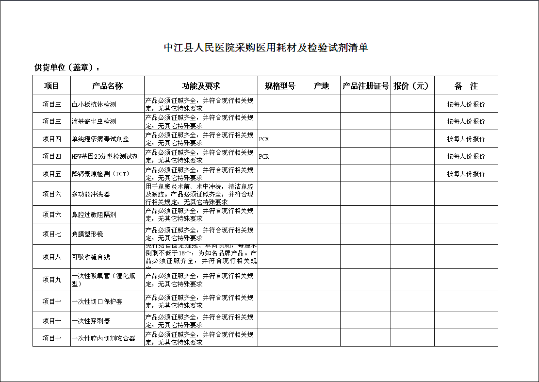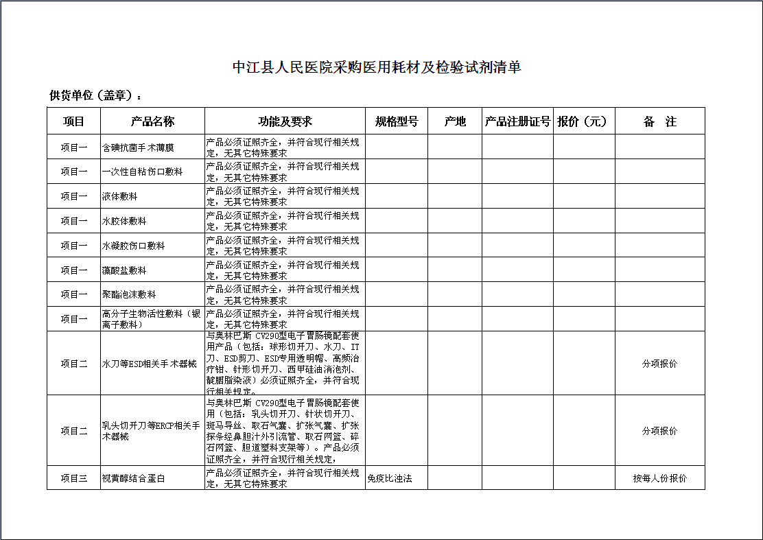1、各供应商根据《中江县人民医院采购医用耗材及检验试剂清单》上产品的要求进行分项竞价。